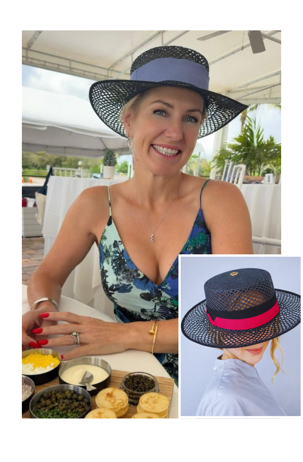 Wearing our signature “Mia” hat with a soft periwinkle band to the polo match in Jupiter—effortless elegance under the Florida sun.